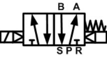 Ein 5/2-Wege-Ventil hat fünf Anschlüsse und zwei Zustände. Zwei Anschlüsse (A und B) werden mit einem gesteuerten Bauteil, z. B. einem doppeltwirkenden Zylinder, verbunden. Ein Anschluss dient der Zufuhr von Druckluft (Anschluss P), die beiden anderen Anschlüsse dienen der Entlüftung (Anschluss S und R) und sind mit Anschluss B bzw. A verbunden. Durch Umschalten des Zustands wird entweder Anschluss A unter Druck gesetzt und Anschluss B entlüftet oder Anschluss A entlüftet und Anschluss B unter Druck gesetzt. Wenn das Ventil zur Steuerung eines doppeltwirkenden Zylinders verwendet wird, wird ein Ventilzustand zur Bewegung des Zylinders in eine Richtung und der andere Zustand zur Bewegung des Zylinders in die entgegengesetzte Richtung verwendet.dieses Ventil ist einfachwirkend, was bedeutet, dass das Ventil von einem Magneten gesteuert wird und durch eine Feder in die Ruhestellung zurückkehrt. Wird der Magnet nicht betätigt, kehrt das Ventil in die Ruhestellung (rechter Quadrant) zurück.