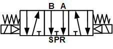 Ein 5/3-Wege-Ventil hat fünf Anschlüsse und drei Stellungen. Die zentrale (Ruhe-)Position kann verschiedene Funktionen haben; bei einem "zentral geschlossenen" Ventil sind alle fünf Anschlüsse in der zentralen Position verschlossen. Die beiden anderen Positionen werden jeweils durch eine eigene Magnetspule gesteuert. Diese Positionen werden verwendet, um Anschluss A zu speisen und Anschluss B zu entlüften, oder umgekehrt. Wenn keine der beiden Spulen aktiviert wird, kehrt das Ventil in die Mittelstellung zurück (monostabil). Dieses Ventil kann z. B. zur Steuerung eines doppeltwirkenden Zylinders verwendet werden, wobei der Zylinder in Zwischenstellungen blockiert werden kann. Durch Betätigung einer der beiden Spulen kann der Zylinder in zwei Richtungen bewegt werden. Die nachstehende Abbildung zeigt eine schematische Darstellung der Funktionsweise eines zentral geschlossenen 5/3-Wege-Ventils.