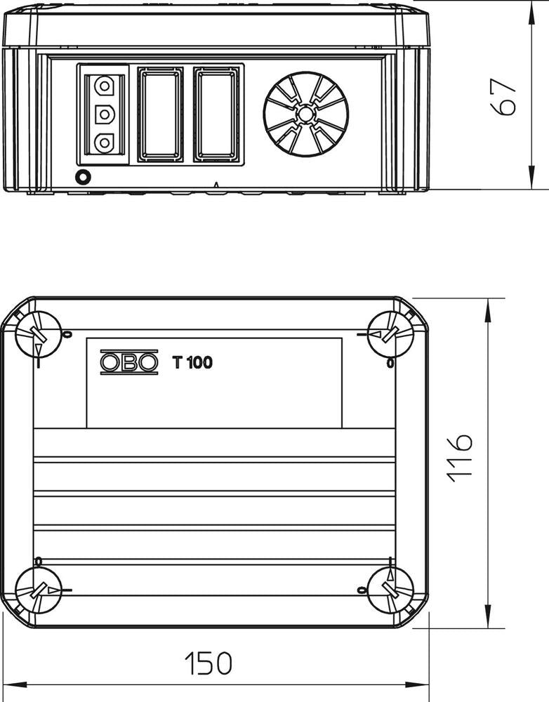 Obo T-Box 100 surface mount box wall/ceiling, plastic, gray, (LxWxH) 150x116x67mm, depth 67mm, wall/ceiling mounting, equipped with, rectangular, max. Conductor cross-section 2.5mm², nominal insulation voltage Ui 500V, for tube diameter, housing penetration type breakout port, rear entry, 4 entries.