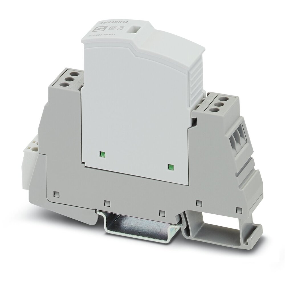 Überspannungsschutz Typ 2/3, bestehend aus Schutzstecker und Sockelelement mit Schraubanschluss. Für einphasige Stromversorgungsnetze mit integrierter Statusanzeige und Fernsignalisierung. Nennspannung = 230 V AC/DC.