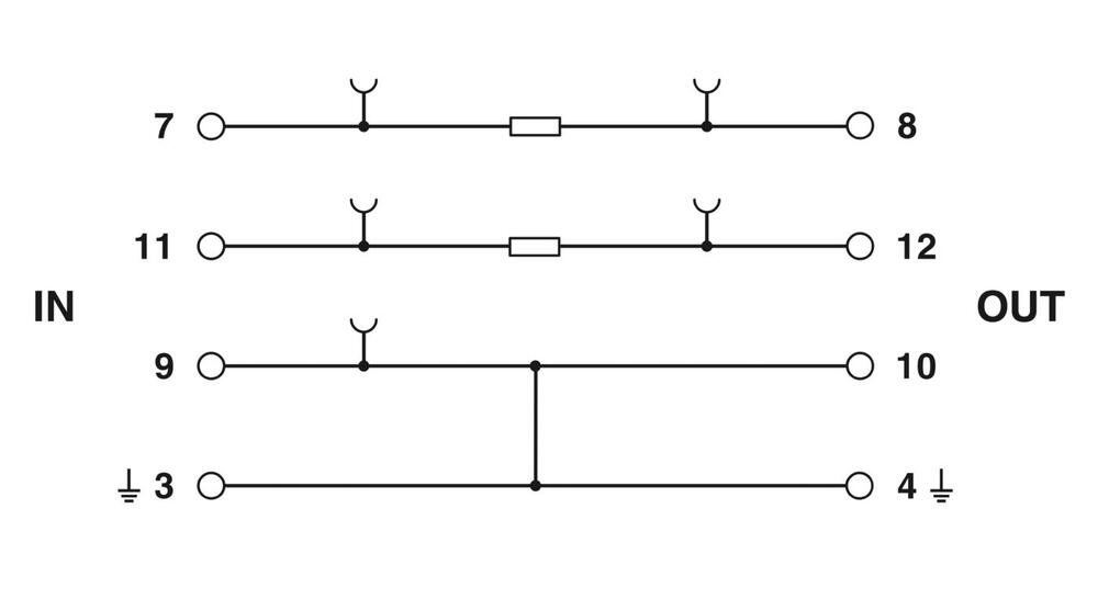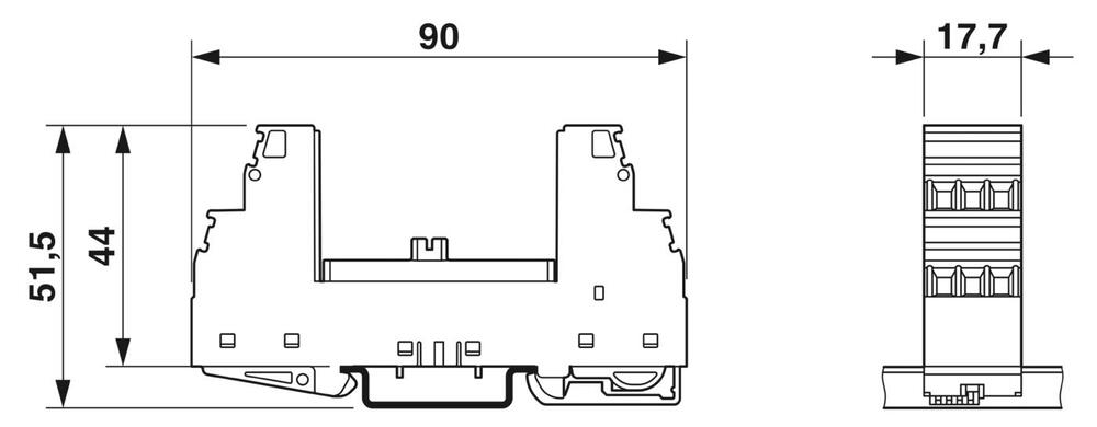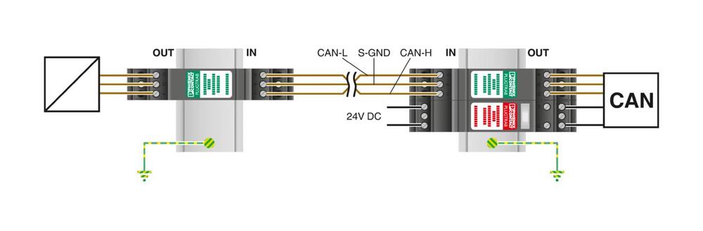 Grundelement für Schutzstecker PT mit Schutzschaltung für einen 2-adrigen erdfreien Signalstromkreis. Montage auf NS 35/7,5 und NS 35/15, Gehäusebreite = 17,5 mm.