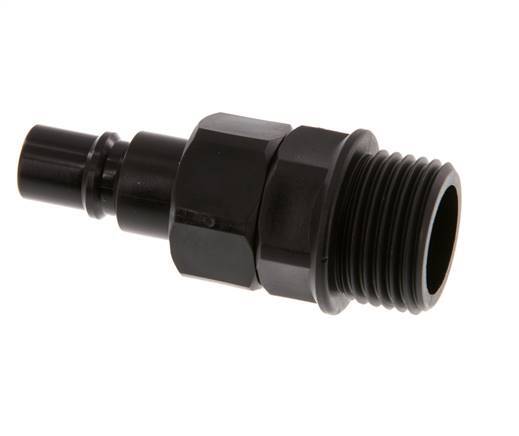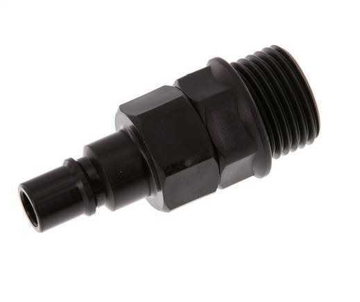 Polyoxymethylen (POM) DN 7.2 Kupplungsstecker mit G 1/2 Zoll Außengewinde. Eine pneumatische Kupplung wird verwendet, um Druckluftwerkzeuge schnell mit einer Druckluftleitung zu verbinden.