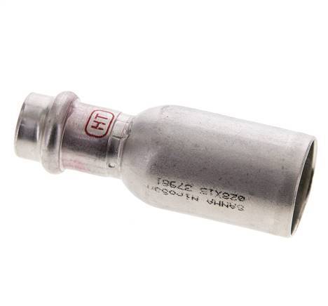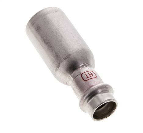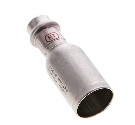 Dies ist eine reduzierende Pressverbindung aus Edelstahl 1.4404. Das Fitting hat einen männlichen Pressanschluss (FTG) und einen weiblichen Pressanschluss. Anschluss 1 ist für ein Rohr mit einem Außendurchmesser von 15 mm ausgelegt und Anschluss 2 hat einen Pressanschluss mit einem Außendurchmesser von 28 mm. Die Armatur hat einen FKM-Dichtring. Der maximale Druck beträgt 25 bar (363 psi). Die Armatur ist für Temperaturen von -20 bis 200 °C (-4 bis 392 °F) geeignet. Vorübergehend kann die Höchsttemperatur +280 °C (536 °F) betragen. Die Einbaulänge beträgt 78 mm.