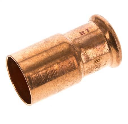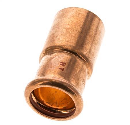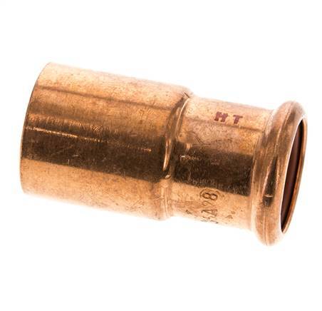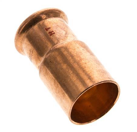 Dies ist ein Reduzierpressfitting aus einer Kupferlegierung. Das Fitting hat einen männlichen Pressanschluss (FTG) und einen weiblichen Pressanschluss. Anschluss 1 ist für ein Rohr mit einem Außendurchmesser von 28 mm ausgelegt und Anschluss 2 hat einen Pressanschluss mit einem Außendurchmesser von 35 mm. Die Armatur hat einen FKM-Dichtring. Der maximale Druck beträgt 16 bar (232 psi). Die Armatur ist für Temperaturen von -20 bis 200 °C (-4 bis 392 °F) geeignet. Vorübergehend kann die Höchsttemperatur +280 °C (536 °F) betragen. Die Einbaulänge beträgt 67 mm.