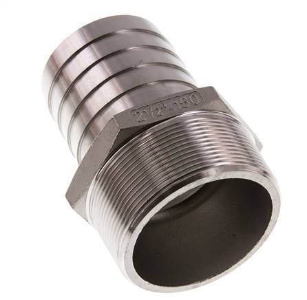 Diese Schlauchverschraubung aus rostfreiem Stahl ist mit einer Tülle und einem Außengewinde ausgestattet. Anschluss 1 hat ein R 2 1/2 Zoll Gewinde. Anschluss 2 ist eine Schlauchsäule, die für einen Schlauch mit einem Innendurchmesser von 60 mm ausgelegt ist. Maximaler Druck von 16 bar (232 psi).