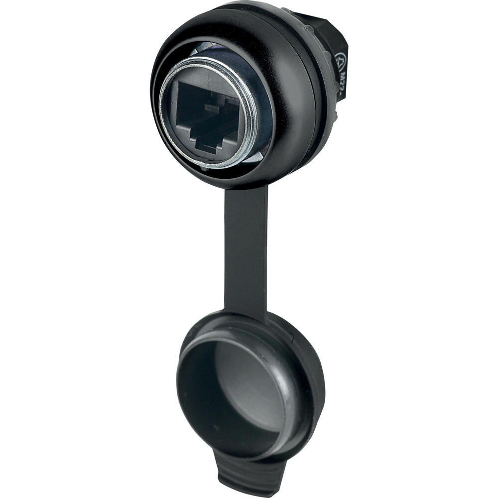 Professionelle 8-polige RJ45-Buchsen-Schnittstelle, die für den Fronttafeleinbau konzipiert ist. Verfügt über die Konformität zur Kategorie 5e und doppelte IP-Schutzarten: IP65 mit geschlossener Abdeckung und IP20 mit angeschlossenem Stecker. Enthält eine schwarze Blendenoberfläche für eine professionelle Integration. Geeignet für Standard 8/8 RJ45-Verbindungen in industriellen Steuerungspaneelen und Geräteinstallationen.