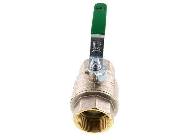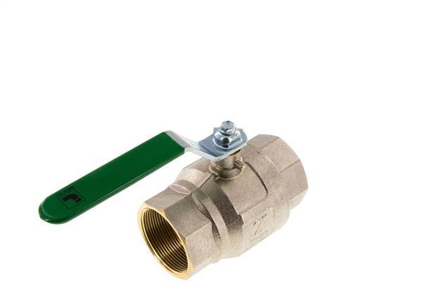 2-Wege-Kugelhahn aus trinkwasserzugelassenem Messing mit Rp 2-Zoll-Anschlüssen und einem Griff für die Ein- und Ausschaltung des Durchflusses. 50 mm Nenndurchmesser und einem maximalen Druck von 25 bar (363 psi). Das Ventil kann in einem Temperaturbereich von -20 bis 150 °C (-4 bis 302 °F) eingesetzt werden. Gehäuse aus verchromtem Messing, Kugel aus Messing und Dichtungen aus PTFE/NBR.