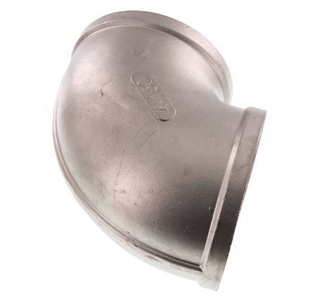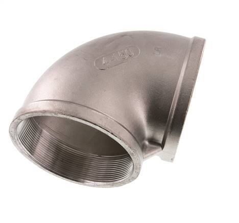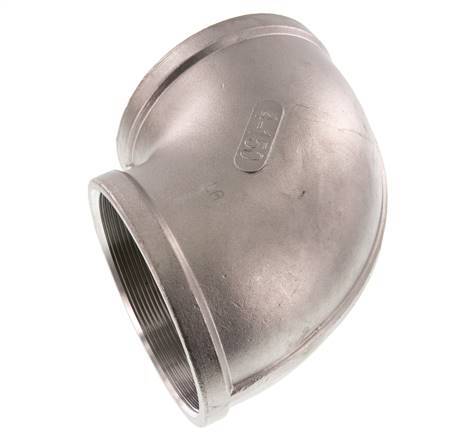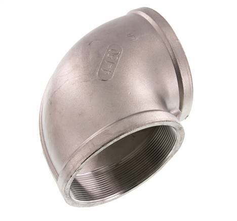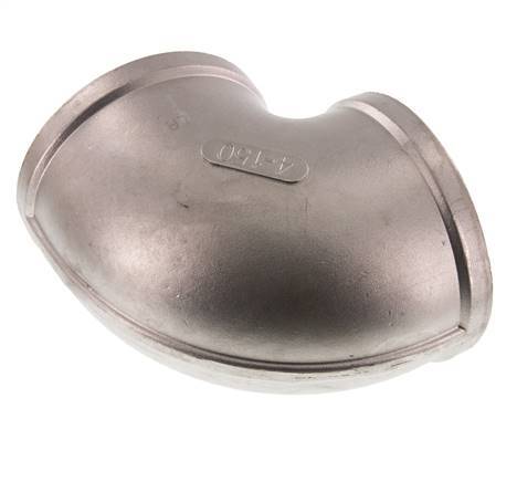 Dieser Krümmer aus Edelstahl ist mit einem abgewinkelten Innengewinde versehen. Anschluss 1 hat ein Rp 4-Zoll-Gewinde. Anschluss 2 hat ein Rp 4-Zoll-Gewinde. Der Eingang und der Ausgang befinden sich in einem 90°-Winkel. Maximaler Druck von 16 bar (232 psi).