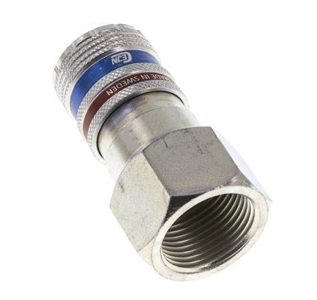 Sicherheits-Luftkupplungsmuffe aus Stahl/Messing DN 10,4 mit G 3/4 Zoll Innengewinde. Diese SicherheitSKUpplungen lassen den Luftdruck in der Leitung ab, indem sie an der Muffe gezogen werden. Wir empfehlen, für SicherheitSKUpplungen Nippel aus gehärtetem Stahl zu verwenden. Der Betriebsdruckbereich beträgt 0 bis 16 bar. Die Steckdose ist für Temperaturen von -20 bis 80°C geeignet. Die Durchflussmenge beträgt 4000 l/min. Das Dichtungsmaterial ist NBR (Nitrilkautschuk).