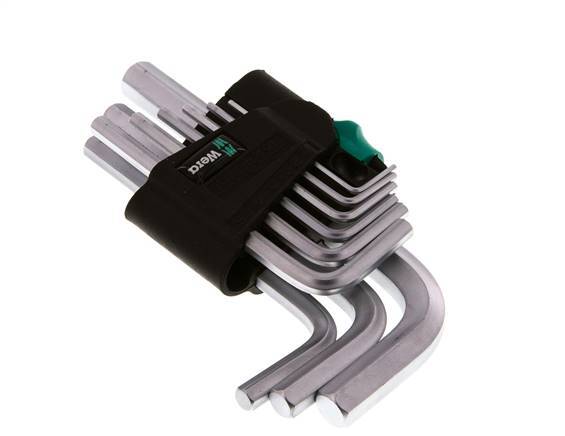 Dies ist ein hochwertiger 9-teiliger Wera-Sechskantschlüssel-Satz. Das Set besteht aus 9 Sechskantschlüsseln in den Größen: 1.5x45, 2x50, 2,5x56, 3x63, 4x70, 5x80, 6x90, 8x100 und 10x112 mm.
